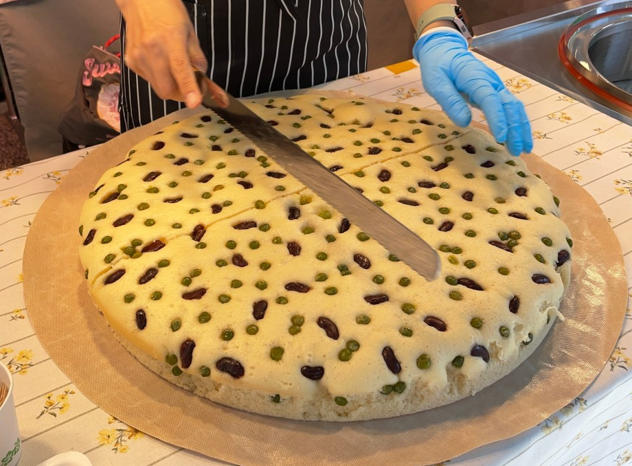 사진의 동그란 술빵을 피자모양으로 8등분해서 한 조각씩 팔고 있어요. 보시다시피 크기가 엄청나게 커서 한조각도 꽤 크답니다.
